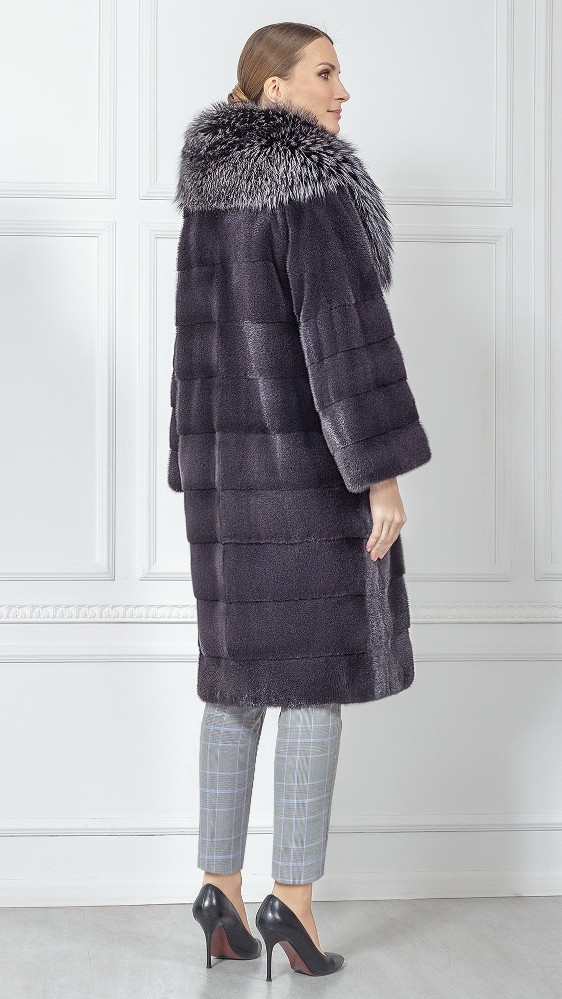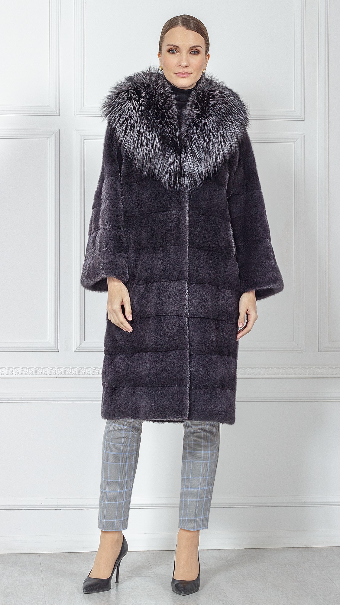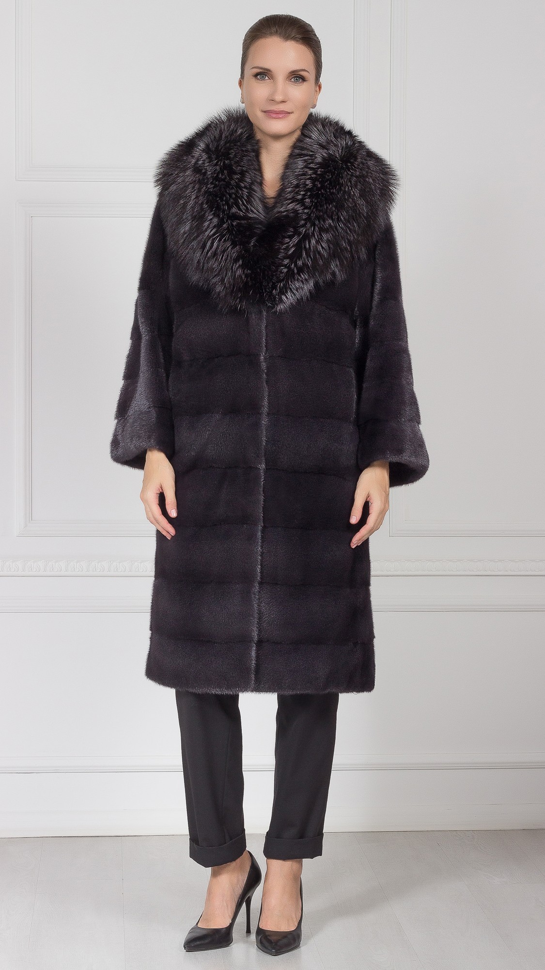 Шуба из меха норки, отделка чернобурая лиса