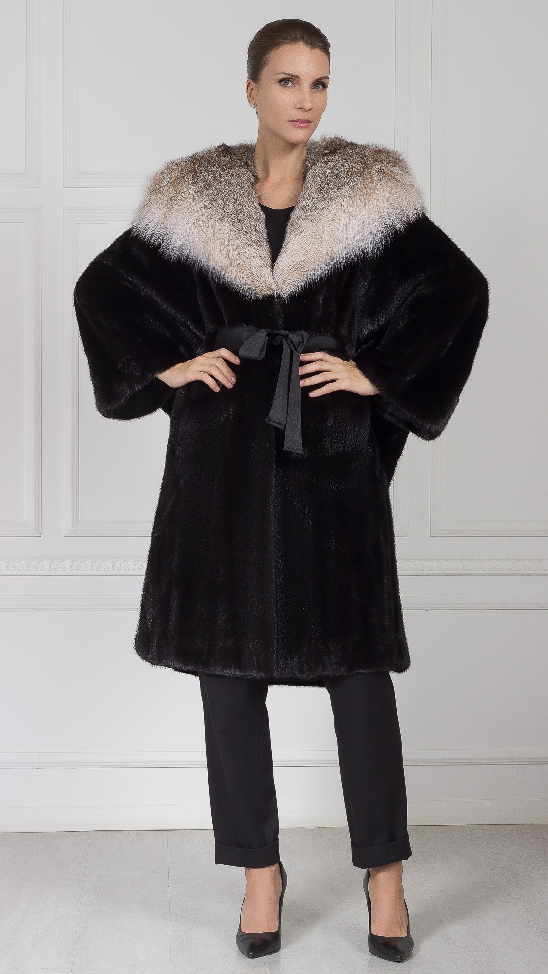 Шуба из меха норки, отделка рысь